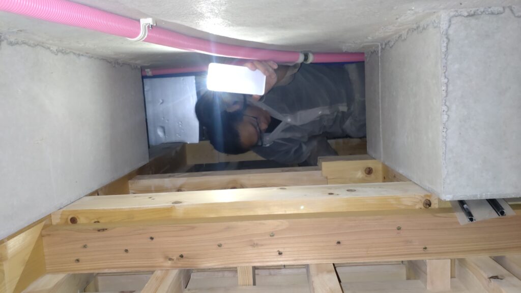 写真は床下の点検作業中の様子。エアサイクルの家の基礎は、まんべんなく空気が流れる構造になっているので床下全体を回ってチェックすることができます。